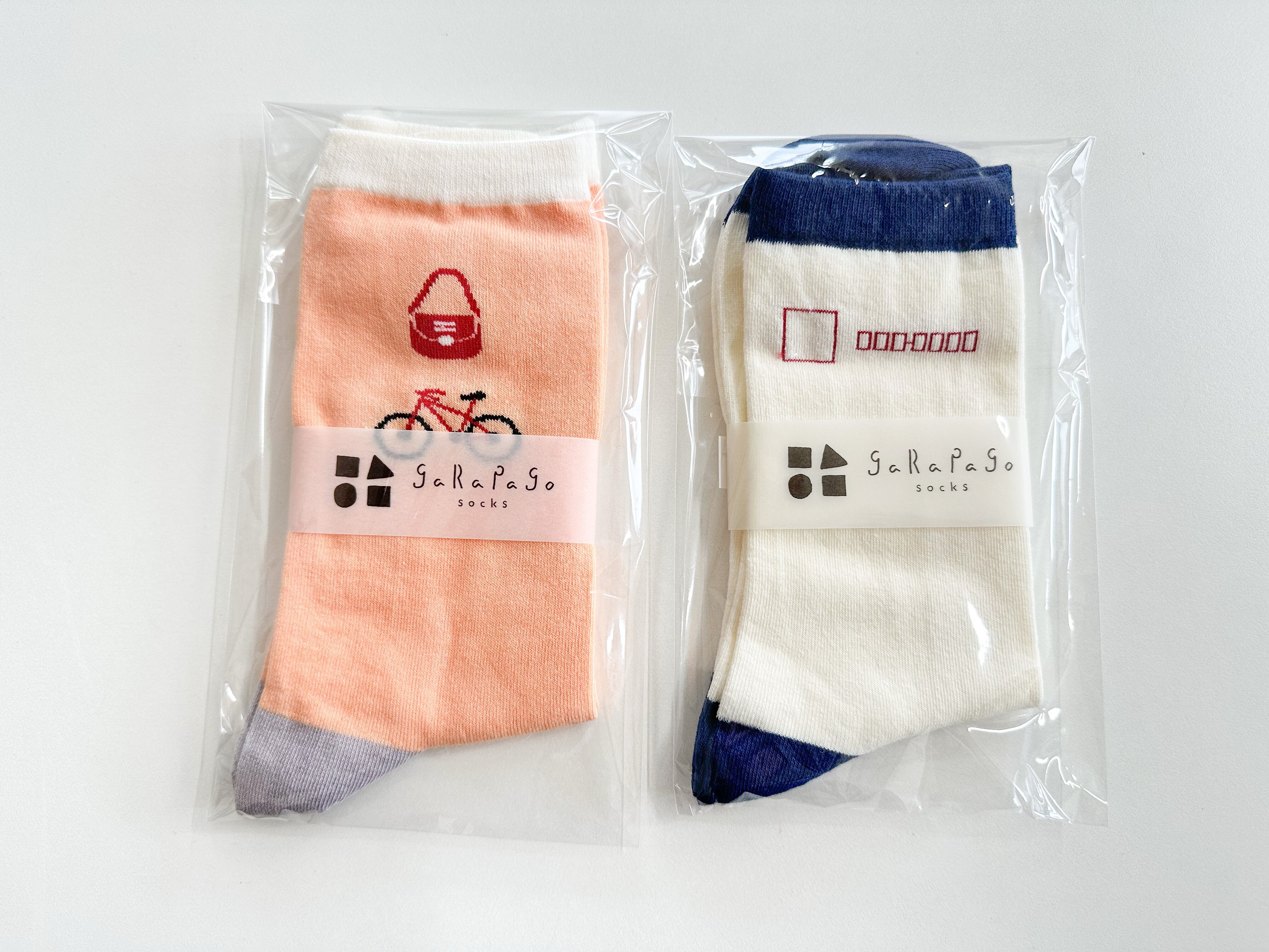 郵便屋さんのバッグと自転車がデザインされた楽しい靴下です。